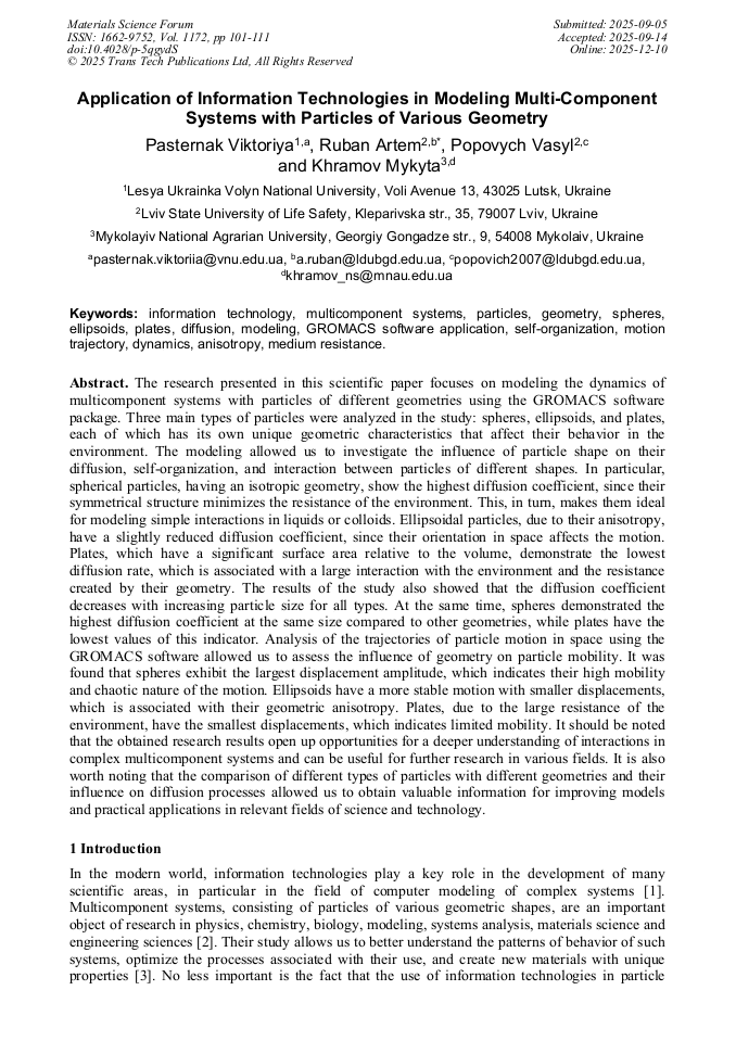 | Citation: | Pasternak, V., Ruban, A., Popovych, V., & Khramov, M. (2025). Application of Information Technologies in Modeling Multi-Component Systems with Particles of Various Geometry. Materials Science Forum, 1172, 101–111. https://doi.org/10.4028/p-5qgydS |